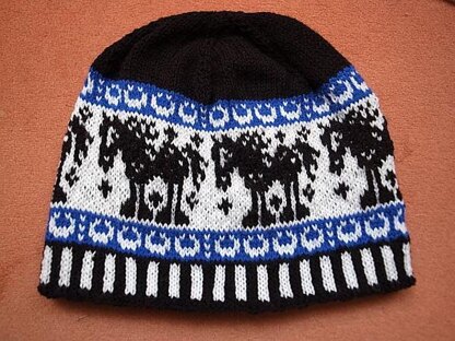 The Mr. Blacky hat starts with a two color ribbing, followed by a horseshoe border pattern and of course: Mr. Blacky the black comic horse!
