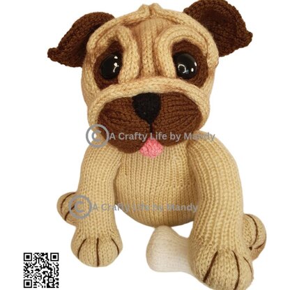 He is knitted flat using 3mm needles and DK yarn. His accessories included within the pattern are his Bandanna collar, His food bowl and food and his little bone.