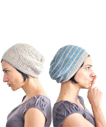Both sides share the same ribbing, which is worked at the start in only one layer to reduce any bulk near the face. The brim is attached seamlessly to both the lace and the stripe hat The brim is attached seamlessly to both the lace and the stripe hat, by using a simple technique that I “unvented” (in the words of Elizabeth Zimmermann). A photo tutorial explains this innovative and new construction that integrates both sides of the hat to the ribbing.