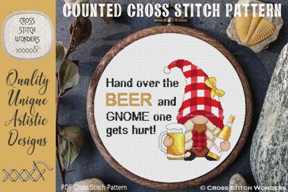 This great MS. BEER GNOME is great whether stitched by itself or along with the funny saying.\n\nMarcia Manning designed this from licensed artwork.\n\nFull design is 145 stitches wide by 114 stitches high and uses 26 colors.\nSize 11 count: 13.18 x 10.36 inches or 33.48 x 26.32 cm\nSize 14 count: 10.36 x 8.14 inches or 26.31 x 20.68 cm\nSize 16 count: 9.06 x 7.13 inches or 23.02 x 18.10 cm\nSize 18 count: 8.06 x 6.33 inches or 20.46 x 16.09 cm\nSize 22 count: 6.59 x 5.18 inches or 16.74 x 13.16 cm\n\n\nJust the Ms. Beer Gnome is 86 stitches wide by 114 stitches high.\nSize 11 count: 7.82 x 10.36 inches or 19.86 x 26.32 cm\nSize 14 count: 6.14 x 8.14 inches or 15.60 x 20.68 cm\nSize 16 count: 5.38 x 7.13 inches or 13.65 x 18.10 cm\nSize 18 count: 4.78 x 6.33 inches or 12.14 x 16.09 cm\nSize 22 count: 3.91 x 5.18 inches or 9.93 x 13.16 cm