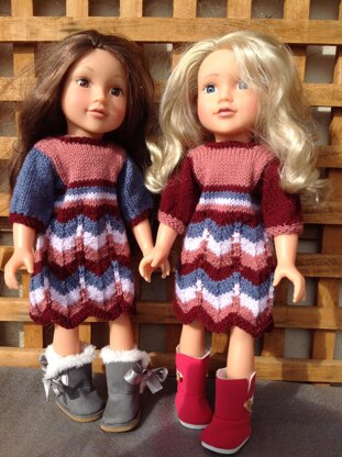 Delightful pattern for 18"/19" Girl Dolls multi coloured chevron striped dress with Bolero and handbag to complete the outfit.
