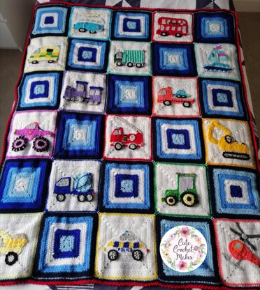 This is my multi vehicle blanket, it is made up of my 15 different vehicle/ transport designs. (These can also be purchased separately). Pattern also includes instructions for the coloured squares, join and border.