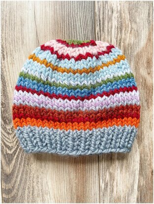 This colorful hat is a great stash buster! It's worked from the bottom up in the round super bulky yarn and larger needles, making it a fun quick knit.