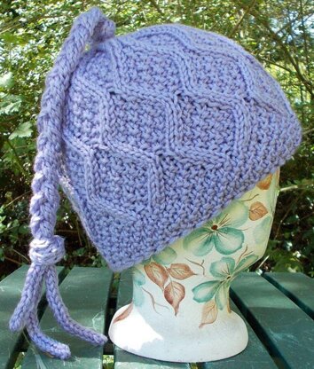 Begin with either ribbing or moss stitch, leading into a pattern of latticed or hour hourglass diamonds, and finish off with either a whimsical braided I-cord tail, or an I-cord “button”. A variety of hats can be created depending upon your choices. In addition, the pattern also includes a ribbed variation, alternating ribbed and moss stitch diamonds.