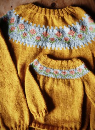 A beautiful round yoke sweater with a fair isle band of vintage-inspired flowers around the shoulders.