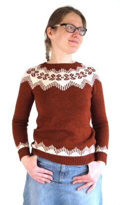 Mundo Novo is a cozy top-down sweater featuring a charming coffee-bean colorwork motif on the round yoke. Worked in the round, the sweater features a twisted-rib neckline, then progresses seamlessly down to the hem, allowing for customization of length and fit along the way.