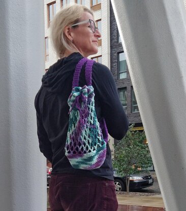 The Muriel Backpack is a cute and stylish way to carry around your daily essentials. It is a cylindrical shape and is constructed by using joined rounds, working from base to brim, with a mesh section in the middle. Finished dimensions are approximately 6" diameter at the base and 12" tall.