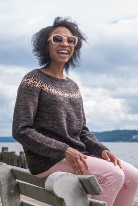 Muriel is worked top-down in one piece. The circular yoke has mosaic colorwork reminiscent of mid-century modern design elements. Was there a formica table in your childhood that looked like this? Muriel is a good mid-century name, and when I was designing the yoke another Muriel was painting the streets in Washington DC!