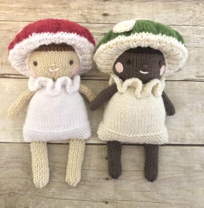 This PDF pattern will instruct you on how to knit my original Mushroom Baby Dolls. The Mushroom Baby Dolls are 9 inches long, and 5 inches wide. Materials: Worsted Weight yarn: Flesh Colored Yarn for skin (I used Light Brown and Dark Brown), color for body and ruffle (I used White and Off-White), yarn for Hair (I used Reddish Brown and Dark Brown), and yarn for Mushroom Hat (I used Red and Green). Poly-fill stuffing Pair of size 4 (U.S.) knitting needles Yarn Needle Thread or yarn for embroidery of face Small amount of Pink Felt and matching thread for the cheeks Techniques: Knit and Purl Stitch Knit 2 stitches together Purl 2 stitches together Casting on and casting off Increasing Decreasing For Increase, any method will work, if using Kf&b method, then work Kf&b when you see “inc.” If using the “make one method,” then when you see “inc” you will knit the next stitch, then make one stitch.