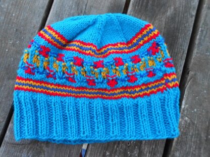 This fun to knit hat started out as an experiment in the Bohus Stitch knitting! It knits up quickly and is very warm. You can use up some of your leftover yards of yarn for the different stripes and the Bohus stitch. The main color will take less than 100 yards. The hat features easy ribbing, then a pretty simple stripe pattern, then in the center is the Bohus pattern stitch which incorporates color and purl stitches to add texture. You only use 2 colors at a time in any row. You finish with a repeat of the stripe pattern then, it is decreased to the top! There you are done!