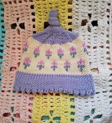 Die Mütze beginnt mit einem Mausezahnbündchen der später in ein Fair Isle Tulpenmuster übergeht. Bei der Krone hat man die Wahl eines flachen Abschlusses oder der Knotenversion.