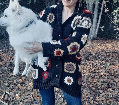 My Granny Cotigan is another take on a popular coat/cardigan construction that is made-up of Granny Squares. The squares joined in panels to create the entire body and sleeves of the cardigan utilizing a continuous Join-As-You-Go method, with no additional ends to weave in. Knitted ribbed cuffs, hem, and shawl collar add a nice finish to this piece. Four large buttons used for the front closure. This cardigan is perfect for using up leftover yarns, combining different colors and making a unique Your Granny Coatigan.