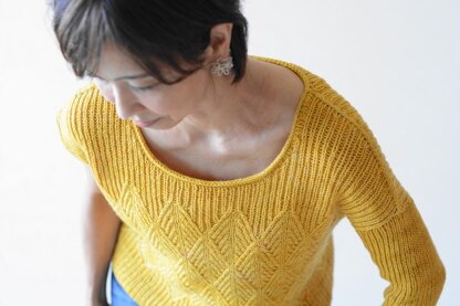 The pullover is worked from the top down. The fronts and backs are provisionally cast on and German short rows are used to shape the shoulders. They are worked back and forth separately to the underarm, then joined to be worked in the round to the hem. On completion of the body, the shoulders are seamed with three-needle bind off, then sleeves stitches are picked up and worked from the top down in the round.