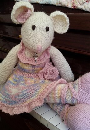 Myka is a knitted ballerina mouse approx 17 inches tall, with clothes that are part of the body or sewn directly onto the body.