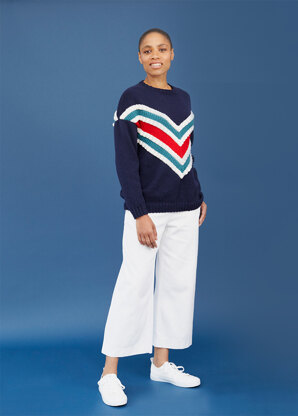 Chevrons and texture are the motifs in the Nadia sweater, inspired by sportswear. It's a great example of using color blocks with texture, and it's great fun to knit for those who love colorwork. It is light to wear, thanks to lofty Rialto DK, a bright and springy DK with great stitch definition.