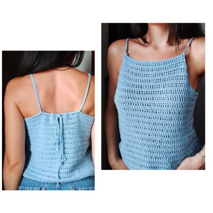 This beginner-friendly pattern features a high neckline for a modern and comfortable fit, with adjustable straps that you can customize to suit your style. The back ties into a charming bow, adding a delicate touch while ensuring the perfect fit. This top is designed to move with you and keep you cool.