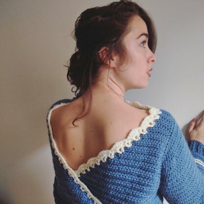 The sweater features an open half-back, or, low v-neck front, and scalloped lace. The lower half of the sweater and the sleeves feature nuanced ribbing. This pattern has S-4XL sizing options. Pictured in the pattern is the Medium size. Included is a full photo tutorial Difficulty Level: Intermediate