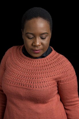 Nandi is a simple lace circular yoke pullover with a stockinette stitch body. The pullover is worked from the top down. The yoke has short rows added after the lace pattern to raise the back of the sweater. The rest of the pullover is a breeze to knit.