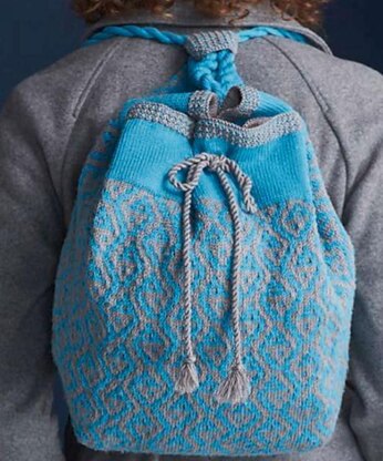 This bag is worked in the mosaic stitch, Yin and Yang, which gives a tapestry like texture contrasting well with the ultra smooth stocking stitch this beautiful fine merino wool accomplishes. The top section is lined, the eyelets going through both layers of fabric through which the drawstring is threaded.