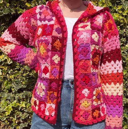 The pieces are joined as you go, so there’s no seaming afterwards. The sleeves are worked in the round downwards from the shoulder to the cuff. The hood is worked upwards in one piece and there’s a short seam to close the top of the hood. This seam is worked in ss and can’t be seen, even when the hood is down. This pattern is great for using up yarn scraps.