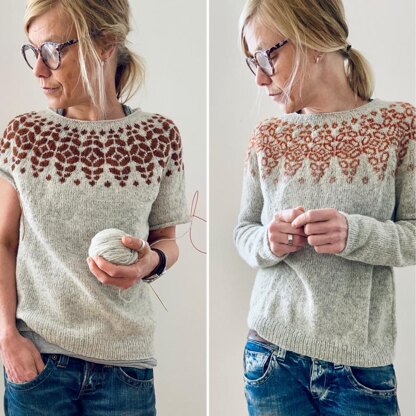 Nasrin is worked seamlessly from the top down. First some short rows are worked back and forth to create a higher back neck and then the yoke is worked in the round to sleeve separation. Some last short rows are worked to finish the yoke shaping right before sleeve stitches are placed on hold. The body is then worked in rounds down to the hem. Sleeves are worked top down to the cuffs last. Optional neck finishing is worked last.