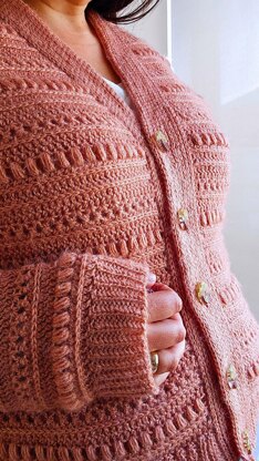 The hip ribbing and button band are worked afterwards, in a texture that mimics knit ribbing and stockinette stitch. Finally, the sleeves are picked up and the cuffs are crocheted at the end.