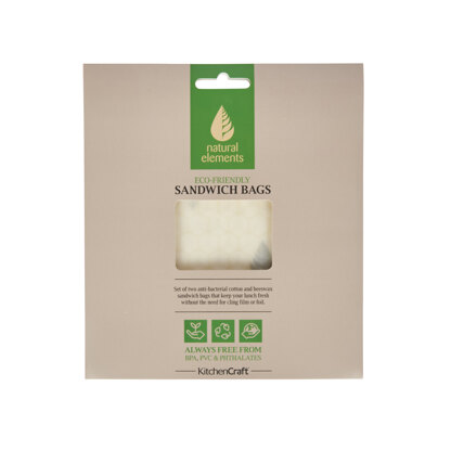 Made from 100% organic cotton and a blend of organic beeswax and essential oils, this set of two reusable sandwich bags are not only a sustainable alternative to plastic and foil wraps but are also naturally anti-bacterial.\n\n100% unbleached cotton is printed with food safe, environmentally friendly soy ink before being infused with a blend of beeswax and oils from ethically and sustainably run hives. Easy to use, gently warm the bag in your hands, place your food item inside the bag and hold to seal. As the bag cools it will hold its shape creating a seal. (Not suitable for raw meat and fish.)\n\nSo say goodbye to plastic and foil wraps and say hello to organic, sustainable food storage... with a little help from the bees.\n\nWhen the wax coating has worn away the bags will start to feel soft and will begin to have trouble sticking to themselves. You can re-fresh your sandwich bags at any time using the Natural Elements Eco-Friendly Bee's Wax Refresh Cubes, available separately (NEBWAXCUBE12PC).\n\nCombining both sustainability, functionality and style, Natural Elements introduces its eco-friendly range, which is designed to reduce plastic, particularly single use within our kitchen and cooking lifestyles. This collection embraces natural materials within the kitchen, bringing a unique organic feel to the home.\n\nAlso available KitchenCraft Natural Elements Eco-Friendly Set of Three Beeswax Food Wraps (NEBWAXWRAP3PC).