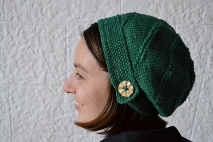 This retro beret pattern is inspired by the mod style of the 1960s. The reverse woven stitch band provides a perfect place to showcase a one-of-a-kind button. A shell-like whorl is created by ridges that spiral inward from the band to the crown. The ceramic button featured here was hand-made by Laura Sheppard.
