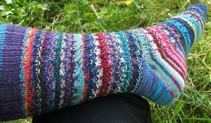 This is not a traditional sock pattern, but merely a “recipe” for applying this stitch to your favorite sock pattern to use up the leftovers that pile up in nearly every sock knitter’s stash.