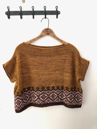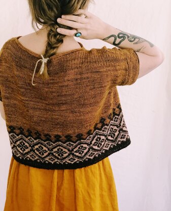 Navelli is a relaxed lightweight summer sweater, knit in the round from the bottom up and featuring colorwork at the body hem and folded sleeves with a tiny peek of contrast color for visual and structural interest. The front and back are separated at the armholes and worked flat with short row shaping at the shoulders. Named for an ancient town in Italy, known as the land of crocuses and saffron, this sweater is the third in my "Knitaly" series of designs (following Tegna and Marettimo).