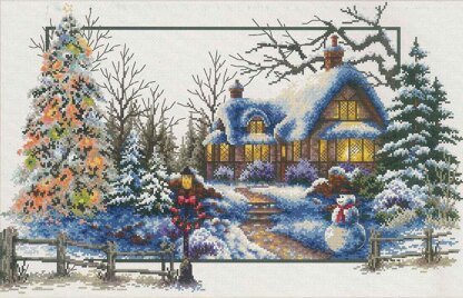 Kit Contents: Precise printed color 14 Count Aida Cloth, pre-sorted luxury polyester embroidery thread, embroidery needle, colour printed chart and multilingual stitching instructions. Design Size: 20" x 12" (51cm x 32cm). This pre printed cross stitch kit features a snowy landscape with a cozy cottage.
