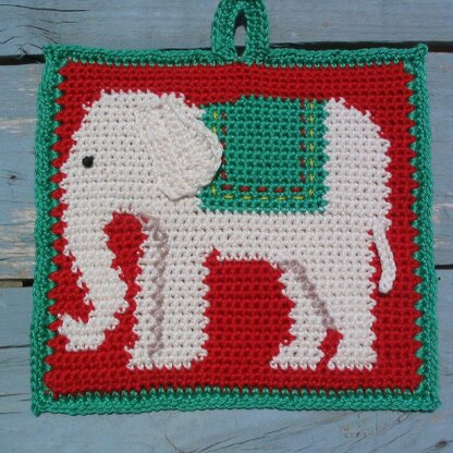 This is an original pattern for a colourful crocheted double thickness potholder with a majestic elephant on the front. The reverse is plain red, and both thicknesses are joined by a double row of crochet in green.