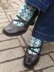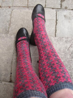 This is a cuff-down pattern with a flap heel and wedge toe. Cuff, heel, and toe are worked in Main Colour and colour-work pattern (argyle motif) is worked in MC and one CC. Instructions provided for both Magic Loop and DPN methods. Recommended that knitters have some experience with sock knitting and with stranded colour-work