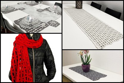 **Russisch:**Сетка, может быть использована как дорожка для стола, декоративная салфетка, коврик, шарф, подставка под гоячее и для многих других целей. Модель можно вязать разной длины и ширины. Описание для каждой салфетки содержит полную схему, пошаговые фотографии и порядовые инструкции.