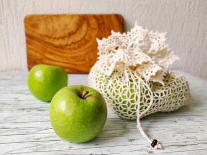 A lightweight drawstring produce bag with an intricate lace pattern, resembling dainty flowers, and a richly decorated textured pointy edge.