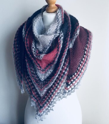 The elegant shawl combines a simple eyelet motif with short rows to combine colours in a striking pattern. Designed to be used with mini skeins, the pattern can be worked in any combination of colours preferred.