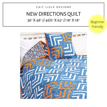 The New Directions Quilt is a fresh take on the traditional quarter log cabin block and is suitable for confident beginners. \n\nThe downloadable pattern includes:\n\nInstructions for Baby (36” x 48”) and Throw (46½” x 62”) quilts and an 18” x 18” cushion\nHelpful tips and diagrams on piecing the blocks and assembling your quilt\nColouring pages to help you choose your fabric layout and colour scheme\n\nShare your projects with #NewDirectionsQuilt and #caitlisledesigns!\n\nPhoto credit: Love Patchwork & Quilting Magazine