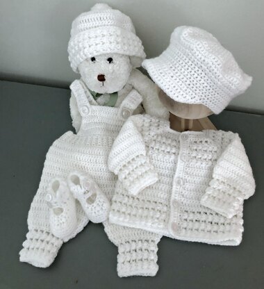 The set features a vintage French knot stitch that gives the pieces an added level of texture and cuteness. The pattern includes instructions for a button-front jacket, overalls, two hat styles—a sporty toboggan and a formal Dutch boy cap, and booties.