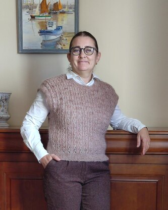 Nigelle Vest is a sleeveless vest for women, both comfortable and precious. With its positive ease and its wide armholes, it is a casual top, while the yarn used and the lace motif makes it a luxuous garment.