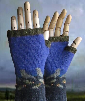 Night Birds are worked in the round from cuff to fingers. The thumb welt is shaped with increases, with additional cast-on stitches to enhance the fit. Colorwork birds and leaves are stranded, with embroidered vines and berries.