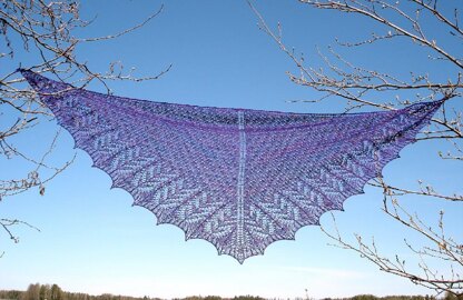 The first and dominant lace pattern is easy to memorize and the size of the shawl is easily adjustable by changing lace repeat amounts. After simple lace, two more complex lace patterns just fly off your needles and the shawl is finished before you know it.