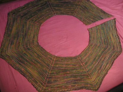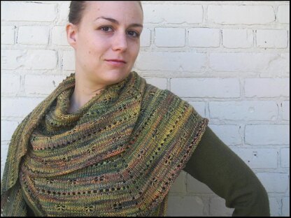Nightlite stole is noticeable by his simple lacy details. The pattern is easy to follow with many rest rows and gives a stole of an interesting octogonal shape that shows off kettle dyed yarns beautifully.