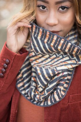 Speckles and solids and colourwork combine in this deep, generous cowl. Corrugated ribbing flows into a geometric colourwork pattern with shifting foreground and background, flowing back into corrugated ribbing. The size provides warming coverage, while shaping ensures that your cowl will sit nicely around your neck. Pattern is charted only. To make Ninety Degrees, you will need to know how to knit, purl, work in the round, do stranded colourwork, and read charts.