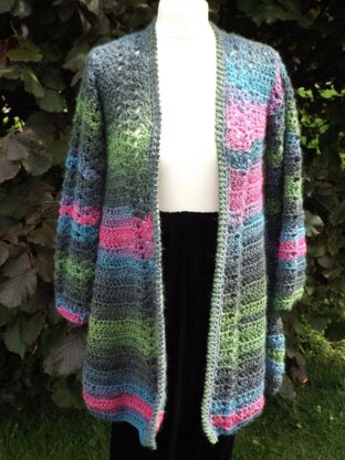 Chunky swing coat crochet pattern.  Uses 900(1000, 1100, 1200) grams of chunky yarn with a 6.00mm crochet hook.  English abbreviations.  Double crochet, treble and chain are used.