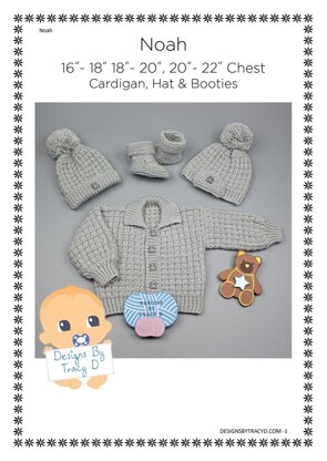 Noah is a knitting pattern for a cardigan, 2 styles of hat, bobble hat and hat with ear flaps, and booties for the first 2 sizes. It is made using DK yarn using 4mm needles