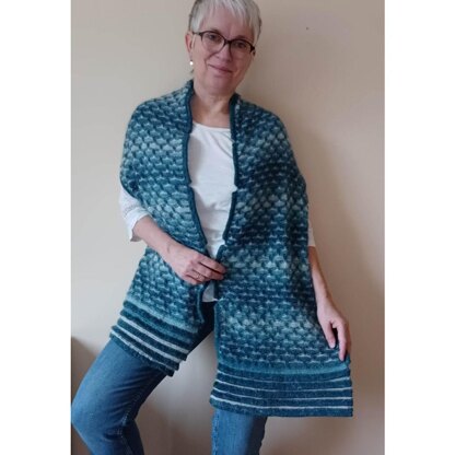 I combined the wool mix with a silk mohair for added lustre and fluffiness and designed an elongated honeycomb stitch for pointy waves which are of a variegated blue at the base and white at the top. The shawl ends are pleated to echo the sea shore and I completed it with (optional) petrol pleats along the edge to add stability. It is worked in two halves, joined with a 3-needle bind-off, and can easily be widened or narrowed. I used 1.5 Purl SOHO skeins and near to one kid silk skein of each colour.