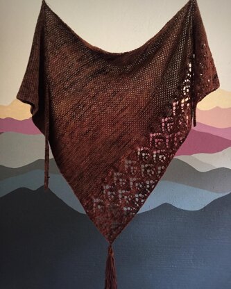 Inspired by the vast open plaines of the Namib desert and the feeling of wanderlust; Nomad is asymmetrical shawl worked sideways, featuring an i-cord edge, mock honeycomb and lace edge. It is finished off with a large tassel.
