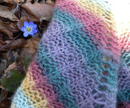 It is worked top down, starting with a garter tab and increasing in every second row. The more sturdy body of the shawl is knitted in fingering, using a simplified brioche stitch (the one that my mother taught me a long time ago), the airy border is knit-on sideways and done in lace weight. The body does not require any purls, it is almost garter stitch. For the border you will have to work short rows.