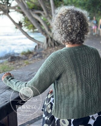 The Noosa cardigan is worked flat in one piece top down, starting with the back. The beautiful cabled spine is worked in the centre of the piece with short rows used for the shoulder shaping. The back piece is worked to the underarms, then front pieces are picked up from the shoulder edges. After joining the fronts and the back, the rest of the body is done in one piece, starting from the underarms.