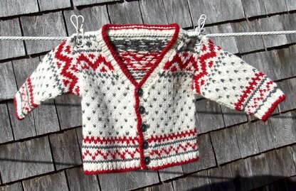 I designed this Nordic-style baby cardigan for my first grandchild, Alex, using traditional Norwegian motifs and layout. Its construction varies from the traditional, though, for minimal finishing! The cardigan is worked back and forth, not steeked, and the sleeve stitches are picked up and knit down, from the armhole, instead of being sewn in. 13 color charts are included, to make it very easy to knit the desired size! These little sizes are quick to knit, especially in a heavy worsted weight yarn, as babies grow quickly!